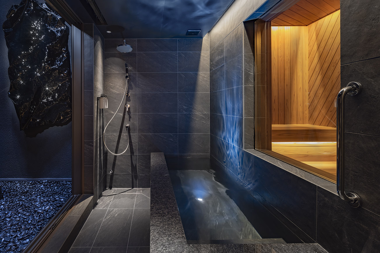 本施設の特徴は、1階フロアをまるごと使用した完全プライベートのサウナ&バスエリアです。印象的なアートを配した中庭を中心に、フィンランド式本格サウナとチラー付き水風呂、ヒーリングスペース、4人でも寛ぐことのできる広々とした浴槽をレイアウトし、ご家族、ご友人、カップルでゆったりとお楽しみいただける設計としました。